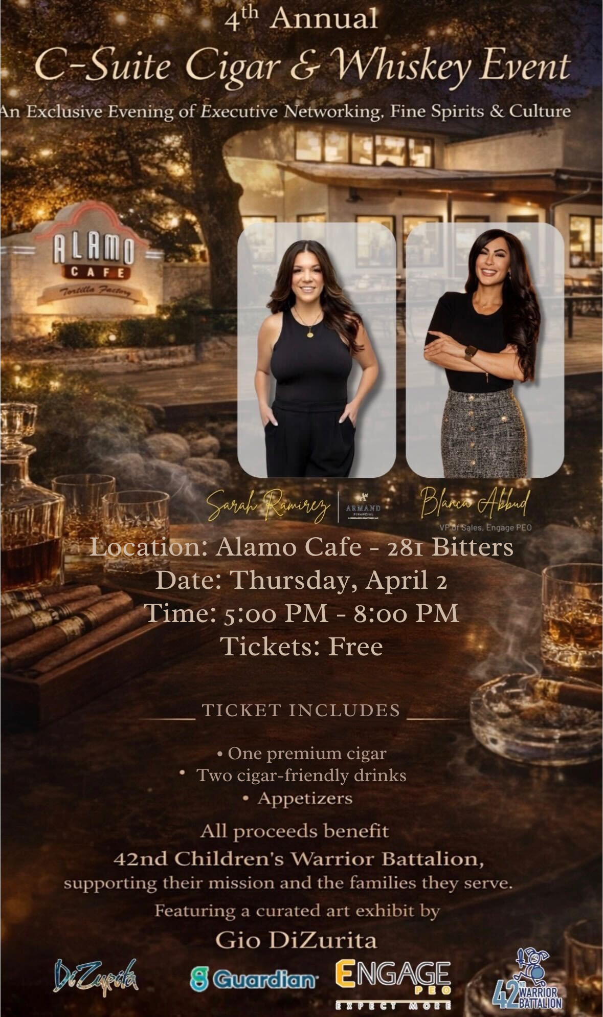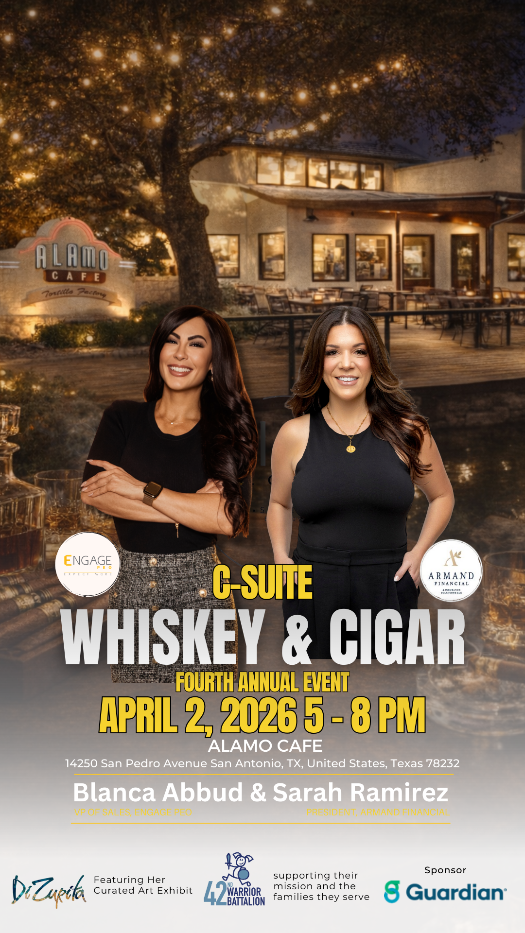 Join us for the 4th Annual C-Suite Whiskey & Cigar Event on Thursday, April 2, 2026 from 5-8 PM at Alamo Cafe, 14250 San Pedro Avenue, San Antonio, TX 78232.